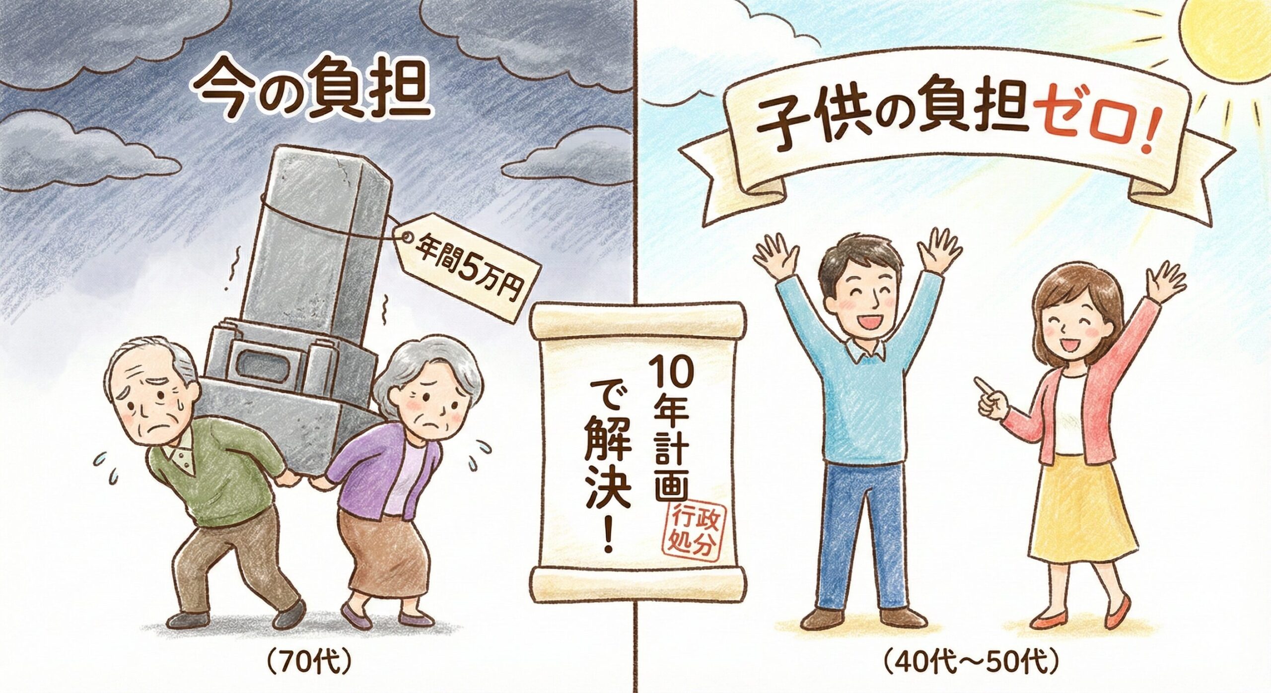 70代男性は石材店との30年来の関係を活かし、年間5万円の負担から子供を完全に解放することに成功しました。高齢者だからこそできる、愛情に満ちた墓じまいの実現をお勧めします。